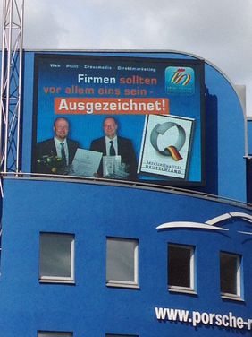 Eine der Hauptstraßen in Rostock führt entlang des Stadthafens. Viele Einheimische und Gäste nutzen diese Tangente, um in die Stadt zu kommen. Direkt gegenüber des Speichers steht diese LED-Wand, von der uns seit einiger Zeit die Firma Hahn Druck + Media GmbH stolz zeigt, dass Sie ServiceQualität lebt und liebt.
