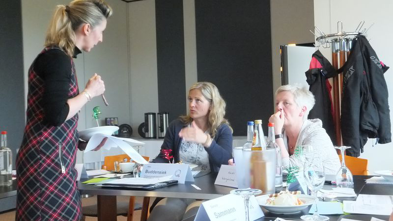 Unter Anleitung der Q-Dozentin Lydia Albers ging es in kleineren Teams kreativ ans Werk, denn neue Ideen und Maßnahmen für den eigenen Betrieb zu finden, ist gar nicht so schwer wie häufig befürchtet. Hierfür einmal einen neuen Weg einzuschlagen und Kreativtechniken zu nutzen, lohnt sich. „Wir haben die Methode „Brainwriting“ im Team angewendet“, berichtet Kathrin Heidemann, Q-Trainer des phaeno in Wolfsburg. „Am Schwierigsten fiel uns der Start. Aber nachdem wir uns auf drei Themengebiete geeinigt hatten, für die wir neue Maßnahmen finden wollten, und die ersten Ideen nieder geschrieben waren, entwickelte sich der Rest sehr schnell und zum Teil in ganz andere Richtungen als zunächst erwartet. Wir sind so auf zahlreiche neue Ideen gekommen“.
