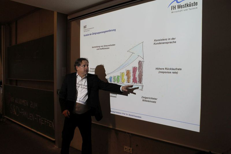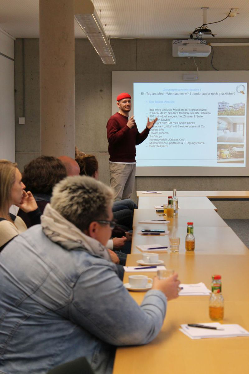 Nach dem Grußwort der Vizepräsidentin Prof. Dr. Anja Wollesen gab Projektmitarbeiterin Monika Sußner einen kurzen Einblick in die Projektaktivitäten im letzten Jahr. Nach diesem allgemeinen Teil der Veranstaltung sollte es nachmittags gut gestärkt ins eigentliche Thema „Zielgruppen im Tourismus“ gehen. Prof. Dr. Bernd Eisenstein setzte mit seinem Vortrag zur Entwicklung der touristischen Zielgruppen Schleswig-Holsteins einen wissenschaftlichen Rahmen, der dann mit Hilfe von Praktikern aus dem Tourismus mit Leben gefüllt wurde. In kurzen Vorträgen wurden die vier Zielgruppen Fahrradfahrer, Naturliebhaber, Familien und Strandurlauber genauer definiert. Es wurde aufgezeigt, welche Erwartungen und Wünsche die jeweiligen Zielgruppen in den Urlaub und somit in die Unternehmen mitbringen. Anhand spannender Beispiele aus den Unternehmen konnten die Zuhörer viele gute Tipps für die Umsetzung in ihrem Betrieb mitnehmen.