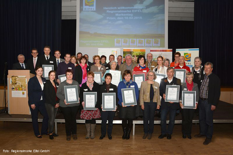 In der Karolingerhalle in Prüm fand am 10. Februar der diesjährige Markentag der Regionalmarke EIFEL statt. Volles Haus - volles Programm. Professionell führte Christina Heidt vom SWR durch den Vormittag. Prüms Bürgermeisterin Mathilde Weinandy, der Bürgermeister der Verbandsgemeinde Prüm, Aloysius Söhngen, und der Bitburg-Prümer Landrat Dr. Joachim Streit setzten in den Grußworten konsequent auf das Thema "Qualität" und arbeiteten Chancen des gemeinsamen Auftretens unter dem Dach der Regionalmarke EIFEL heraus.