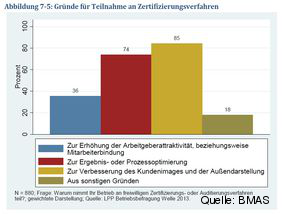 65 % der befragten Betriebe gaben an, freiwillig einem Zertifizierungsverfahren teilzunehmen. Nach Zertifizierungsbreichen aufgefächert sind Zertifizierungen im Bereich Prozessqualität mit 88 % die mit Abstand häufigste Gruppe (siehe Abbildung 7-4). Mit 85 % ist die „Verbesserung des Kundesnimages und der Außendarstellung“ der häufigste Grund für die Teilnahme an einem Zertifizierungsverfahren, dicht gefolgt vom Grund der „Ergebnis- und -Prozessoptimierung“ (siehe Abbildung 7-5).
