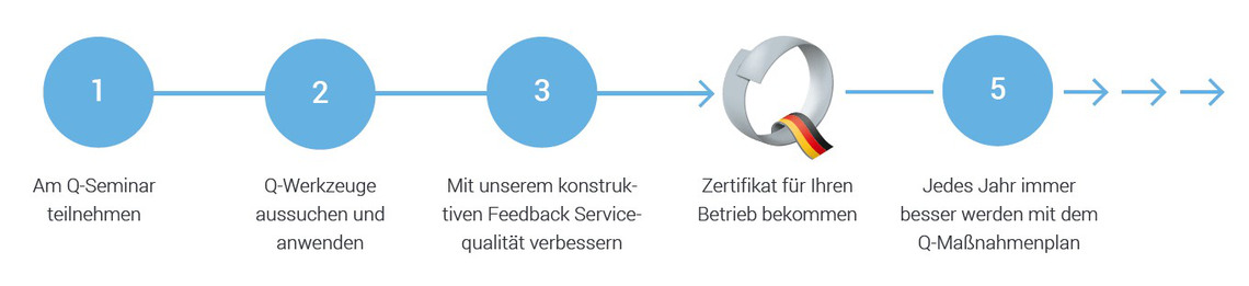 Zusätzlich arbeiten Sie mit der Q-Servicekette und erhalten dazu ein Feedback von der Q-Prüfstelle. Nutzen Sie dieses Feedback, um weitere Maßnahmen zur Verbesserung Ihrer Servicequalität zu entwickeln. Erstellen Sie dann Ihren Q-Maßnahmenplan.